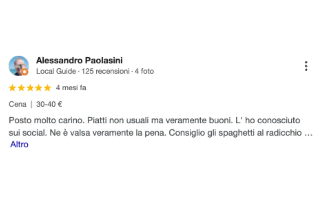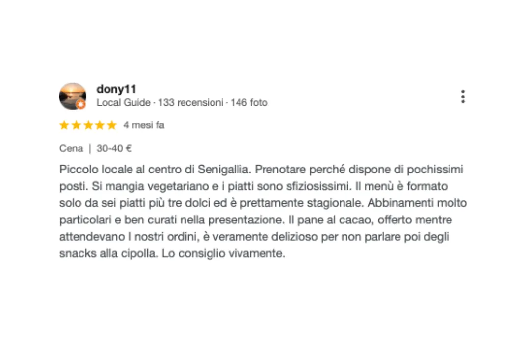 Leggi cosa pensa chi ha provato, la nostra cucina vegetale e l’atmosfera accogliente e rilassata che ci contraddistingue. Ti aspettiamo per far vivere un’esperienza che ha già conquistato tanti